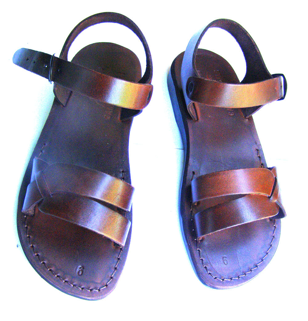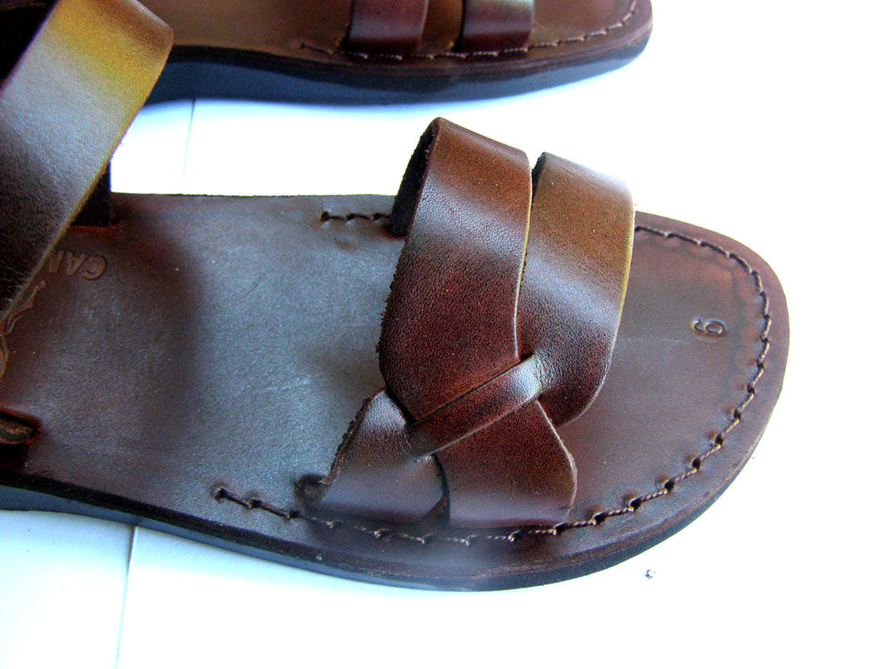 High-quality leather handmade sandals with rubber sole and metal buckle for closure.